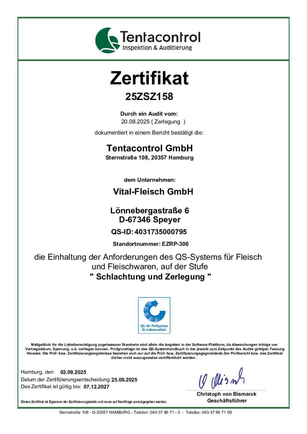 Der permanente Austausch zwischen Produktion und Qualitätssicherung garantiert unseren hohen Standard. Die Vital-Fleisch GmbH verfügt über alle nötigen Zertifikate und überzeugt in den jährlichen Audits stets auf einem hohen Niveau.