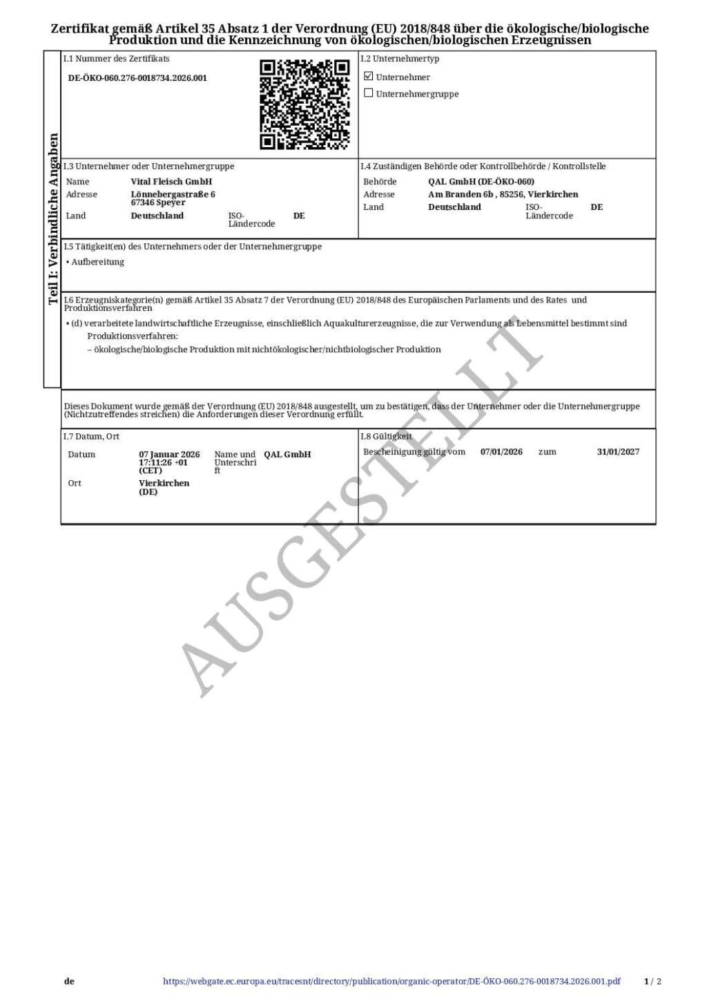 Der permanente Austausch zwischen Produktion und Qualitätssicherung garantiert unseren hohen Standard. Die Vital-Fleisch GmbH verfügt über alle nötigen Zertifikate und überzeugt in den jährlichen Audits stets auf einem hohen Niveau.